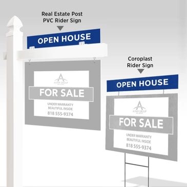 Designed to sit or “ride” atop a standard coroplast sign, rider signs are custom printed with your customers’ designs in full color to draw even more attention to their coroplast yard signs. They’re easily attached with the included metal pins to provide additional, temporary information or to add even more visual interest. Available in a